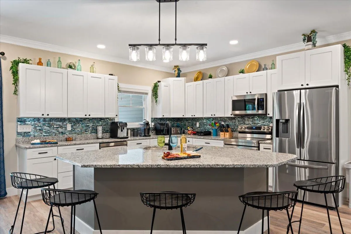 Embark on a culinary adventure at our bespoke wooden dining table for 14, while the spacious kitchen island accommodates 5 more, ensuring a vibrant dining experience for all!